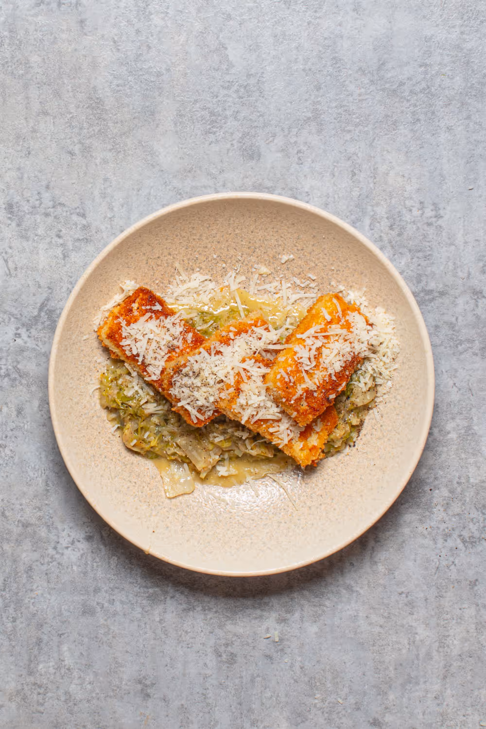 A fresh twist on an Italian classic - notes of cacio e pepe with a veggie-forward upgrade! The golden, crispy fried tofu is the real star here.