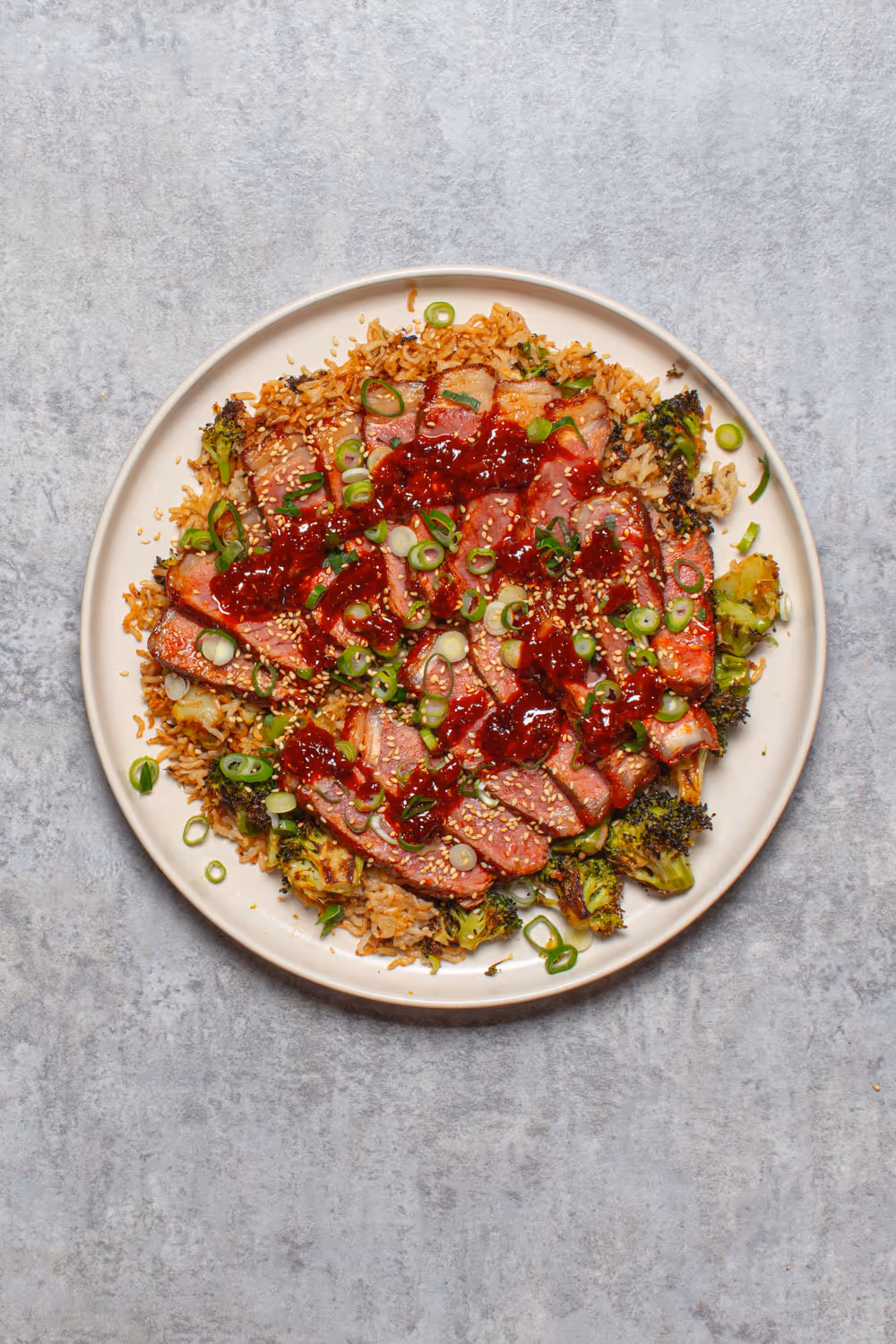 Juicy, marinated steak with caramelised edges, served over roasted broccoli rice with a punchy Korean-inspired sauce. A proper midweek treat!